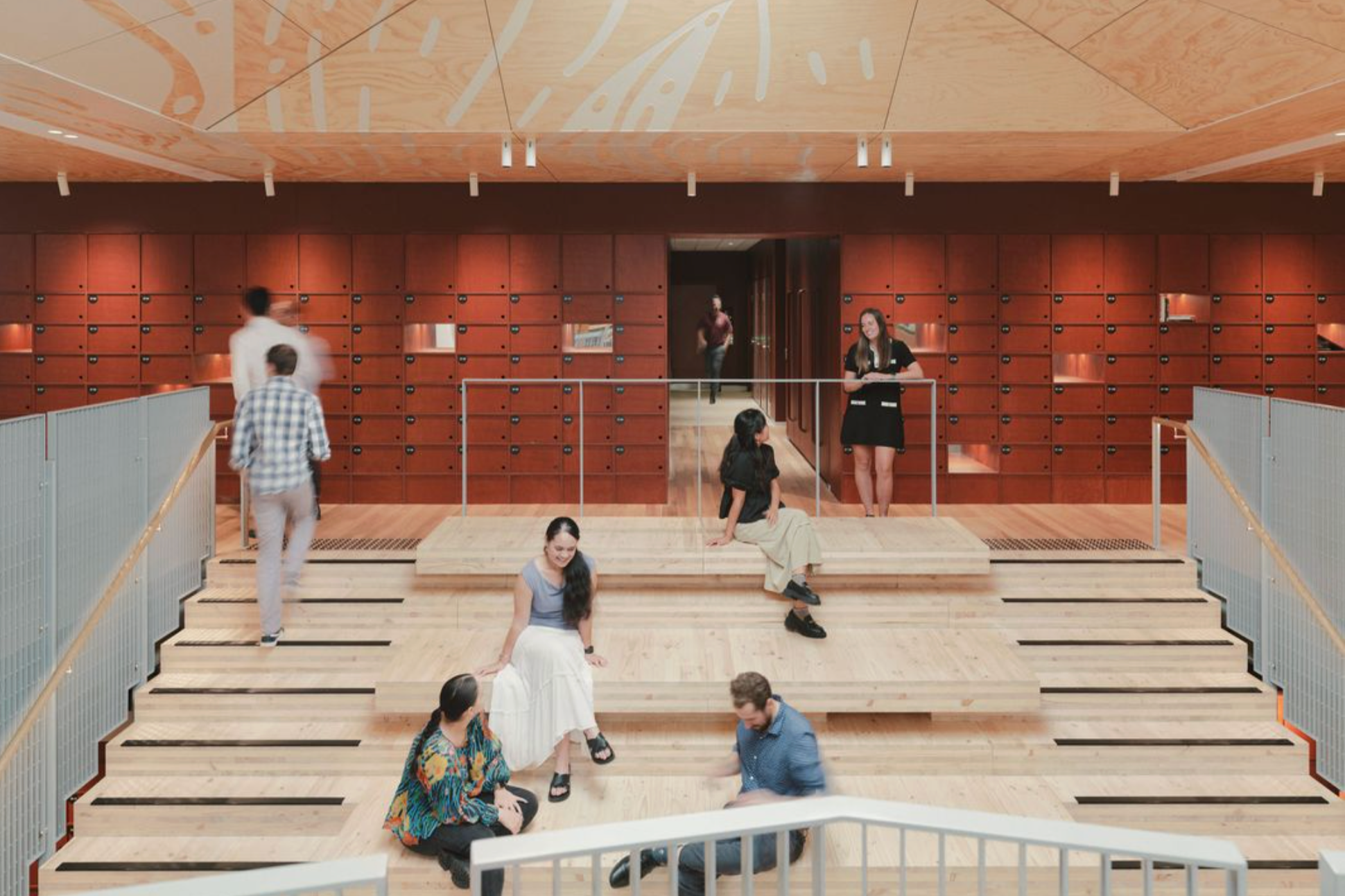 A reflective metal ceiling evokes the movement of water, referencing both the Brisbane River and the historical creek that once crossed the site. The double-height arrival space features artwork by Waanyi and Kalkadoon artist Keisha Leon, creating an ongoing dialogue with Sky Country. Blaklash also developed a contemporary interpretation of Acknowledgement of Country, written as prose and woven throughout the workplace environment. Furniture and joinery details reference endemic plant species and riparian ecosystems, allowing the cultural narrative of Country to become part of everyday workplace experience.