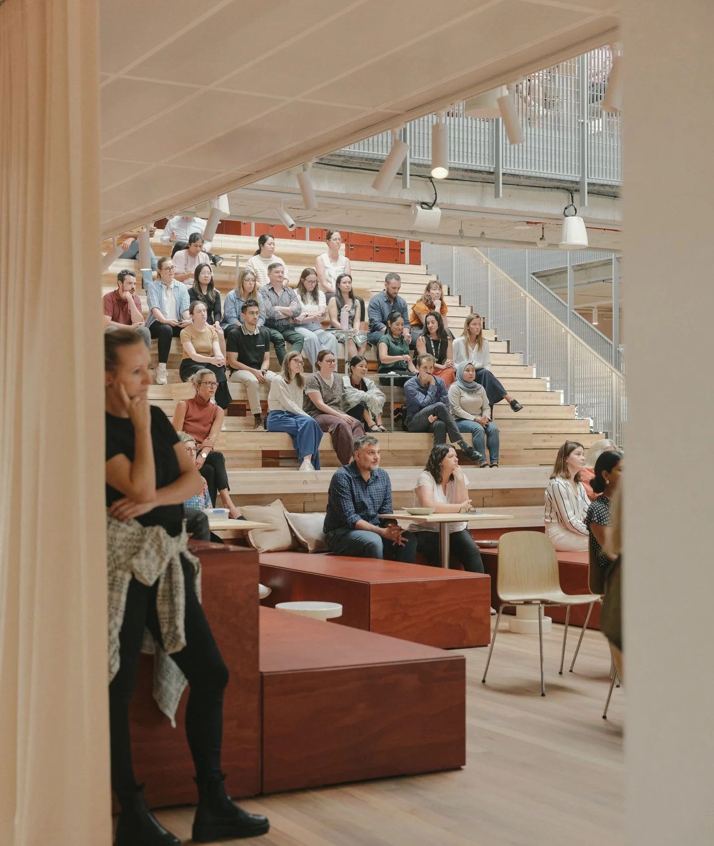 A timber staircase sits at the heart of the workplace, linking two floors and creating a natural gathering point for the studio. Constructed from modular cross-laminated timber panels, the staircase follows a kit-of-parts approach, with each component sized to fit the building’s goods lift and assembled on site using mechanical screw fixings that allow for future disassembly or reuse. The use of CLT responds to both environmental and practical considerations, offering a lighter structure with carbon sequestration benefits while avoiding wet trades such as concrete. Steel beams support the structure discreetly, allowing the timber to remain visually prominent, while the stepped form doubles as informal seating for events, conversations and everyday interaction between teams.
