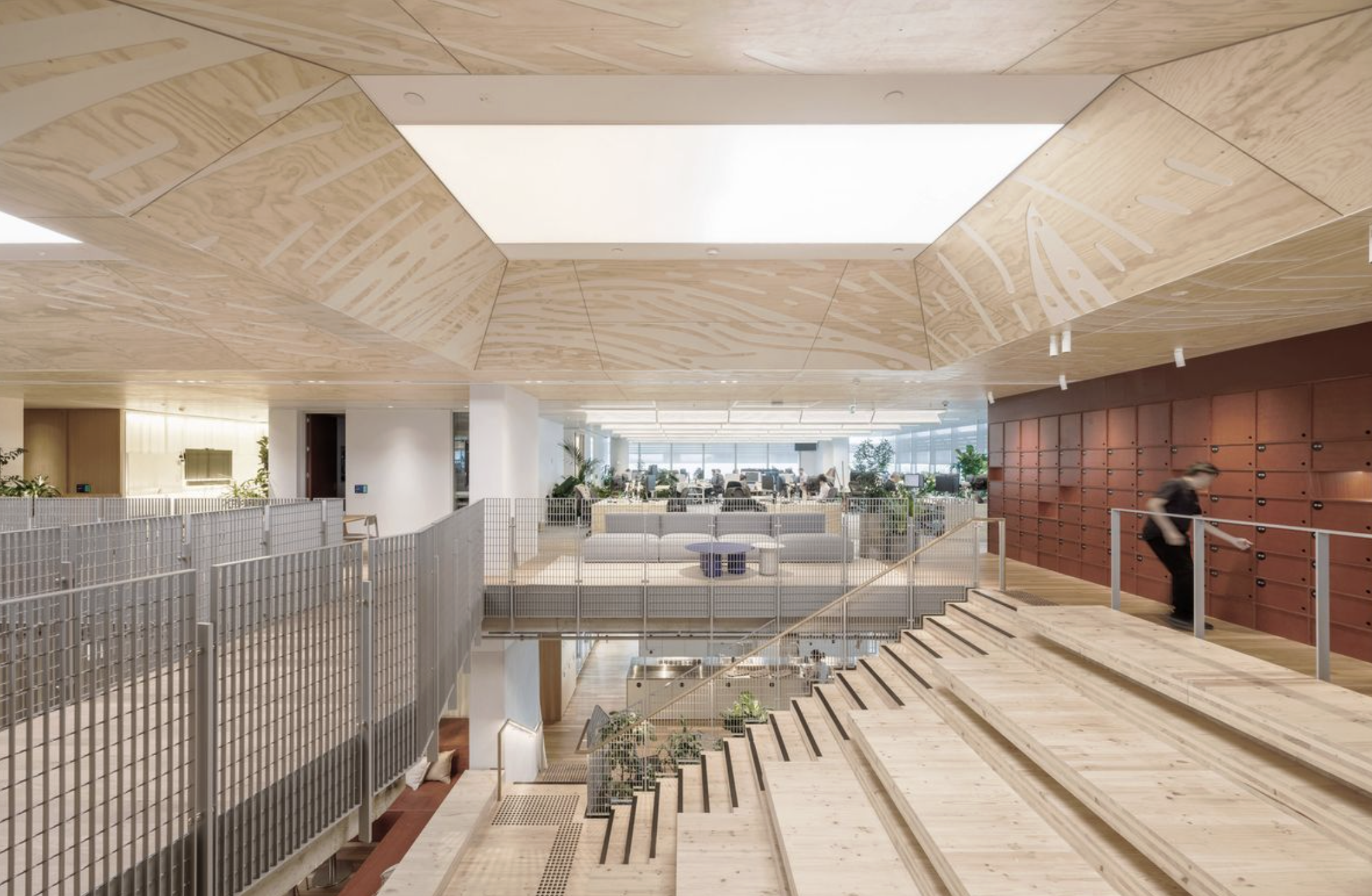 Circular design strategies appear throughout the workplace, often revealing the stories behind the materials themselves. Original mesh balustrades from the building’s staircase have been retained and wrapped around columns to form vertical planting structures. Recycled timber studs create partitions around print areas and storage spaces, while perforated metal salvaged from a closing Ripple Iron factory has been repurposed as café joinery and wall cladding.