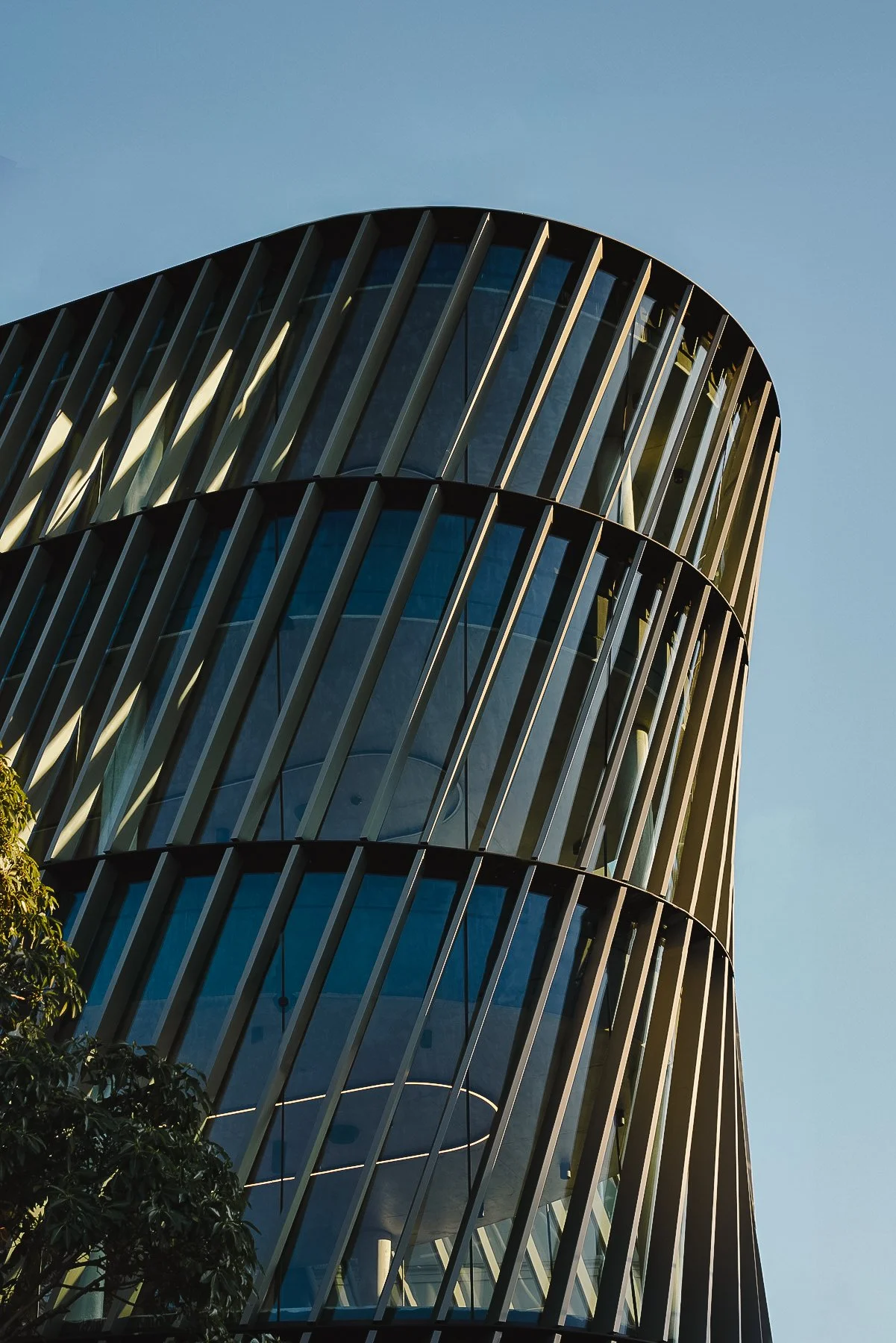 The building’s distinctive contemporary form responds to its three-sided exposure through angled patinated zinc fins fixed to a curtain wall of double-curved glass. The effect is both striking and highly considered. The fins modulate sunlight, screen the building from its exposed urban context, and allow generous natural light to flood the office spaces within. The result is a five-storey landmark that respectfully addresses its prominent setting while making a confident architectural statement.